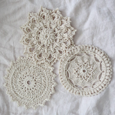 Ensemble de 3 petits napperons crochetés. Chaque napperon mesure environ 10 cm.